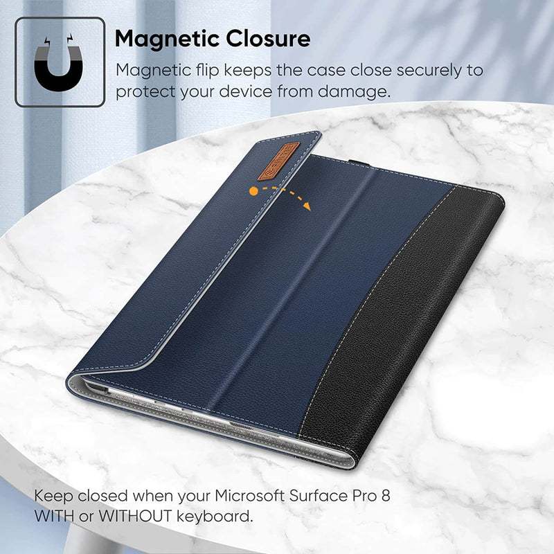 Designed for Microsoft Surface Pro 8 13-inch Touchscreen (2021 Release). The case works with or without the Surface Pro type cover keyboard (keyboard not included). Made of premium synthetic leather exterior and soft microfiber interior.