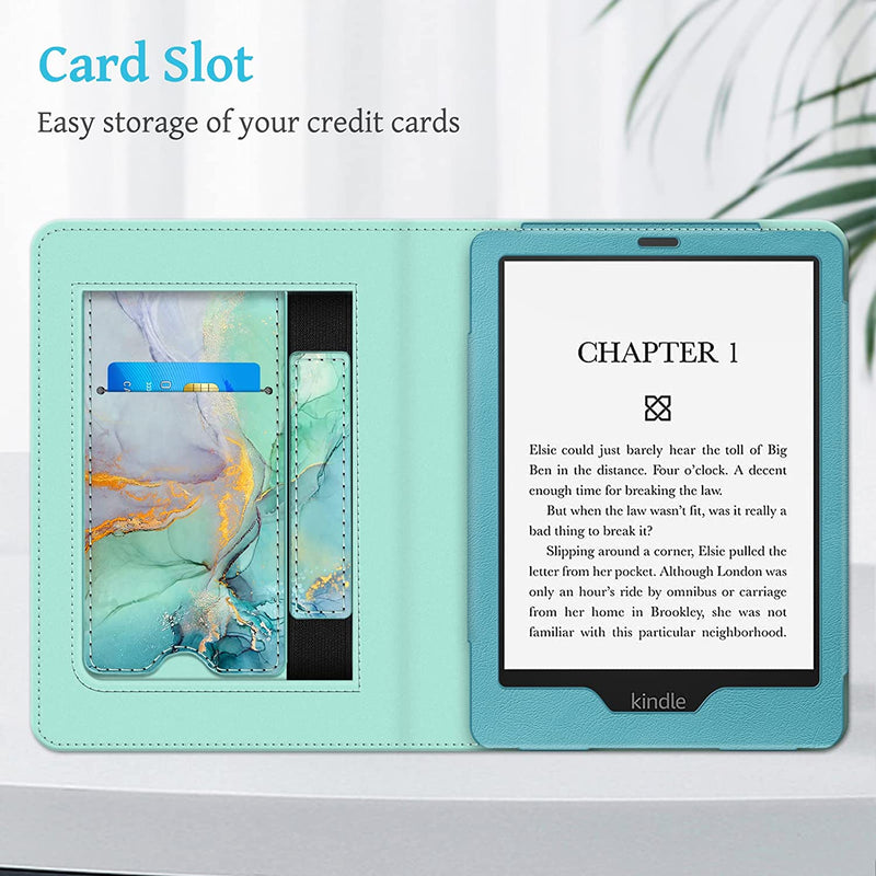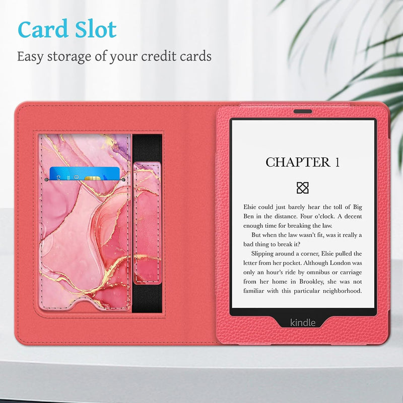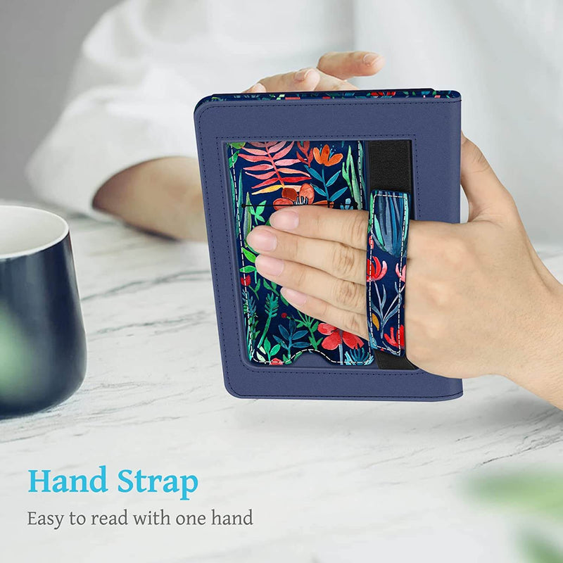 The foldable stand design could set your hands free during your reading. A built-in card slot is convenient for storing your cards and cash. A hand strap allows you to read more easily and comfortably with one hand.