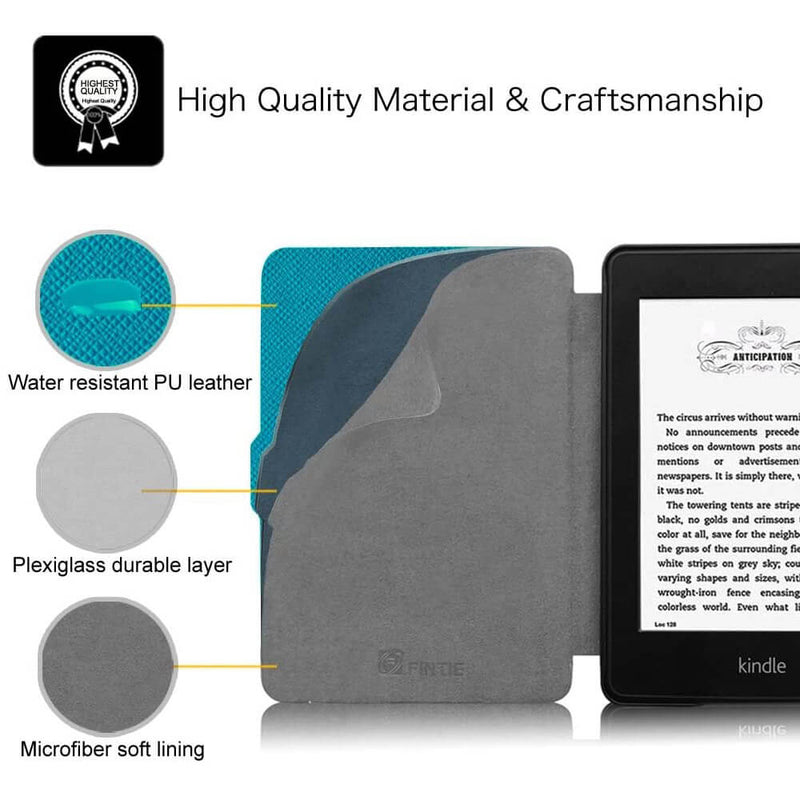The Fintie Kindle case is made from durable synthetic leather with soft interior to prevent scratches. Super slim and ultra-lightweight edition. Wake or put your device to sleep by opening or closing the cover.