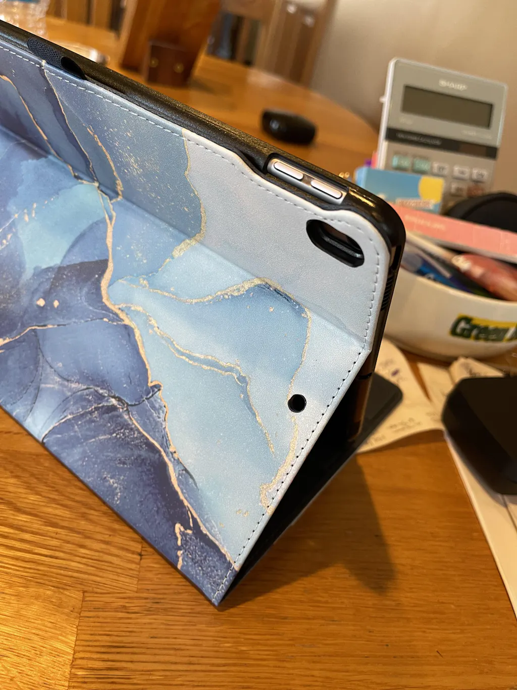 Built with a durable PU (synthetic) leather exterior and soft microfiber interior, this Fintie sleek shield case features 2 anti-slip grooves to allow users to adjust the iPad to multiple angles securely. And, the document card pocket is designed for storing business cards, bank cards, notes or bills while on the go.